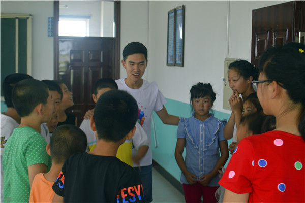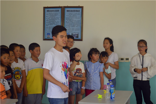 7月14日下午2时整,航建学院三下乡彩虹服务队在七棵树镇中心学??沽送哦友盗返目纬蹋穸佣映ぶ懿┏傻H沃鹘怖鲜?,服务队其他成员担任助教老师。