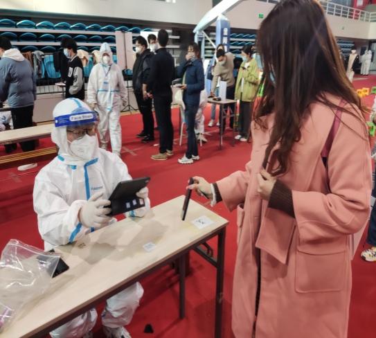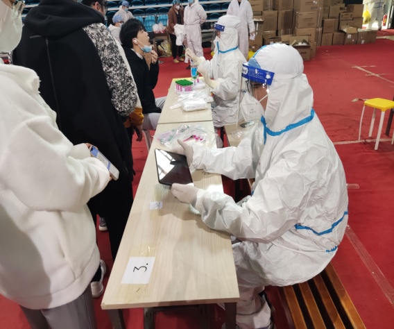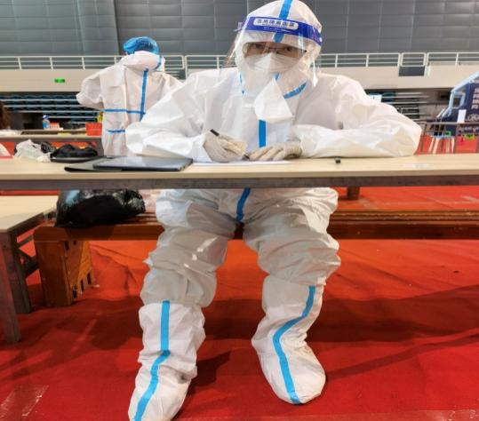 本次校内核酸检测工作志愿者主要是承担核酸检测扫码工作,志愿者们完成上岗培训之后就开始进入了工作岗位。信息录入并不复杂,可以通过扫码或者将检测人的信息输入完成,但是志愿者们都要穿着厚厚的防护服和防护面罩,一个班4个小时的时间里,大家是不能上厕所的。因此,志愿者们上岗前都尽量少吃少喝,工作期间全程不喝水。