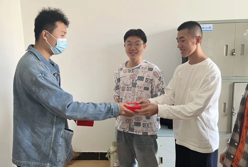 9月8日,航建学院新生辅导员高明、程业强、刘广谦、王臻汉及军训指导员冯庆为同学们送上祝福和代表着团圆和睦、和谐美满的中秋月饼。