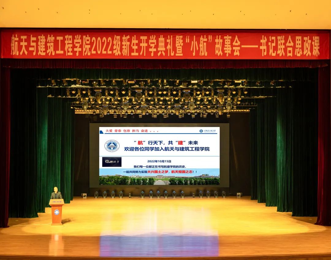 10月15日下午14:00,航天与建筑工程学院2022级新生开学典礼暨“小航”故事会——书记联合思政课在启航剧场举行。校党委常委、宣传部部长、统战部部长吕冬诗,校党委常委、组织部部长、机关党委书记、党校常务副校长张石梅,以及学院领导班子、基层学术组织负责人、教师党支部书记、新生班主任参加活动,活动由学院党委副书记梁艳艳主持。